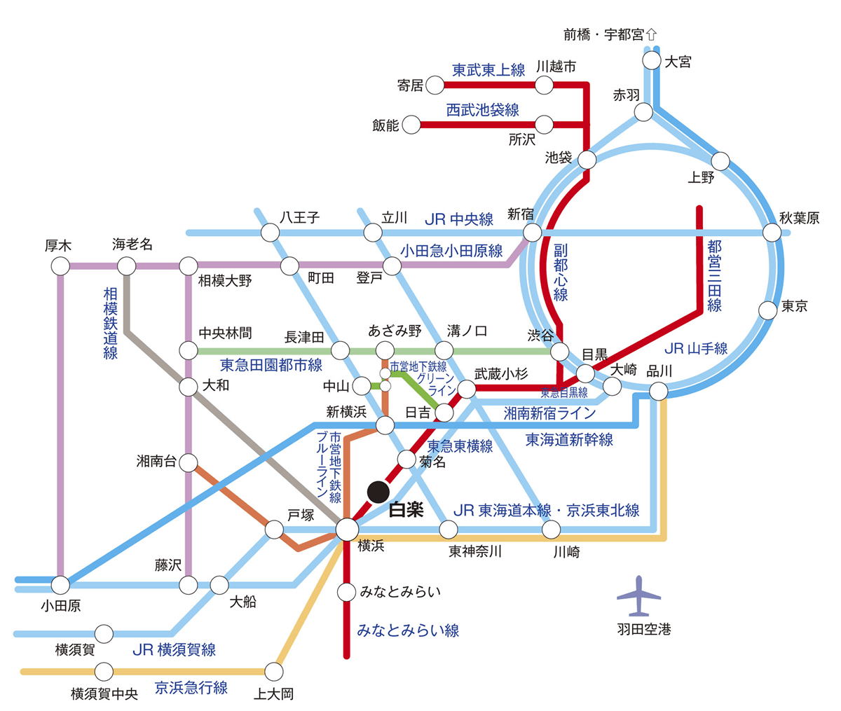 首都圏主要駅から東急東横線・白楽駅まで